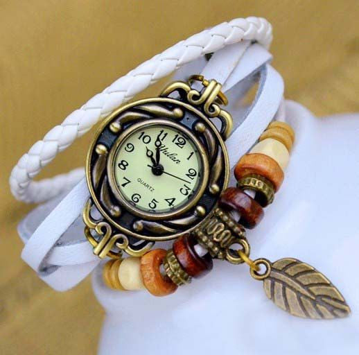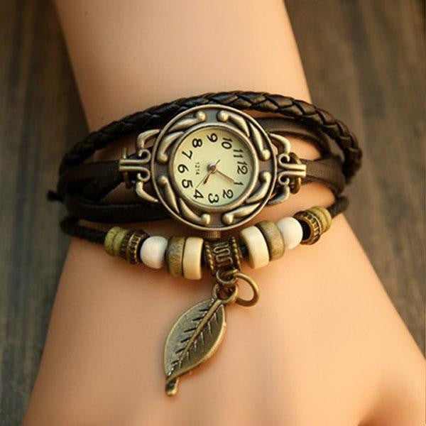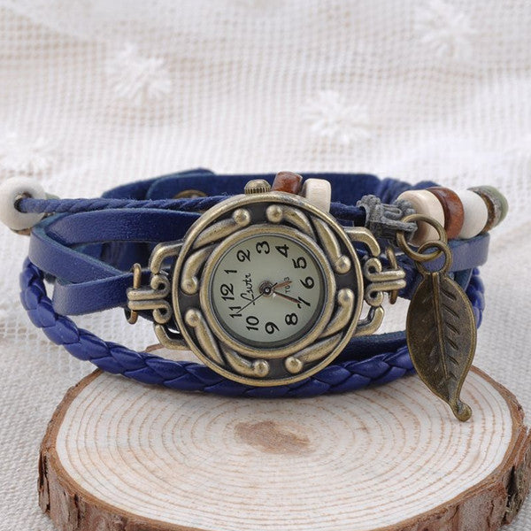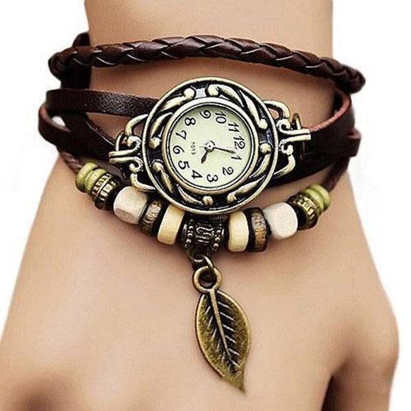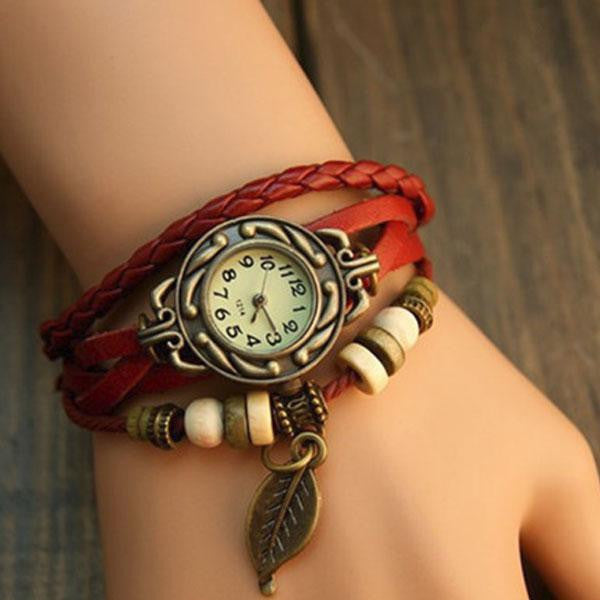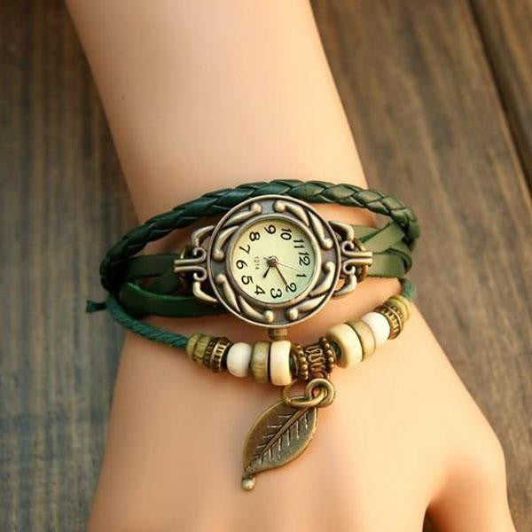 This Boho-Chic Vintage-Inspired Handmade Watch is the ultimate bohemian accessory, it adds some instant vintage-inspired style to any look. Made from vegan leather, this woven cuff-style bracelet is accented by beautiful beads and a sweet leaf charm.