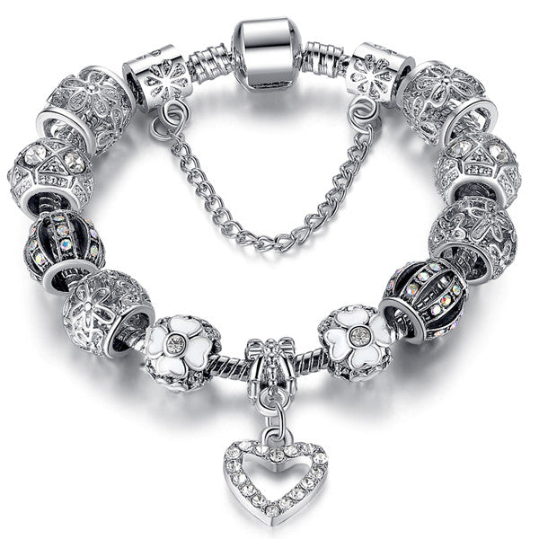 Adorn this perfect Silver Charm Bracelet with pre-designed charms to match. We love the assorted silver and crystal detailed charms that pair so well with one another! Not to mention the dainty chain and heart that suspends from the bracelet, giving Its classy and immaculate look. This piece effortlessly ties your whole ensemble together with its finishing touches. If ever you're in need of a sophisticated pick-me-up, we recommend you accessorize with this beautiful Silver Heart Charm Bracelet!